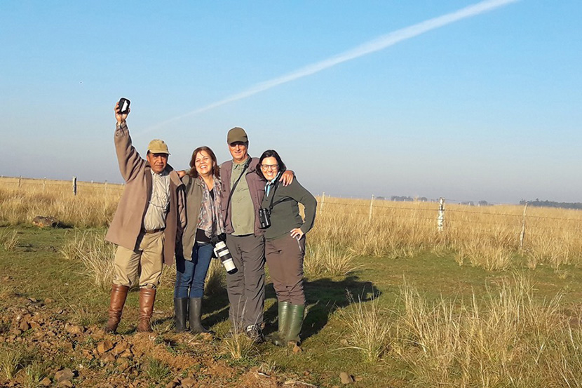 O destino agora era a Fazenda Coqueiro, onde a ideia era almoçar com os anfitriões e tentar o registro do mergulhão-grande, presença constante em uma lagoa. Logo na chegada, avistamos o mergulhão, mas ele estava muito longe para boas fotos. O jeito então foi fazer uma foto do grupo, até para aproveitar a bela paisagem. Depois de mais uma ótima refeição, chegou o momento de dizer “até breve” aos amigos da fronteira, que mais uma vez tão bem nos acolheram. Despedidas são naturalmente melancólicas e lugares, momentos e pessoas especiais deixam sempre um gosto de quero mais. Mesmo assim, embarcamos de volta rumo às Missões. Mas antes mesmo de deixarmos a fazenda, conseguimos melhores fotos do mergulhão-grande, por meio de uma "avançada técnica de observação" desenvolvida pelo Paulo, que consiste em aproveitar os mergulhos da ave para ligar o carro e chegar um pouco mais perto, desligando o motor logo em seguida. Após três mergulhos, conseguimos uma excelente aproximação, melhorando o registro. Quando o mergulhão finalmente percebeu que estávamos próximos, passou a nadar na direção oposta.